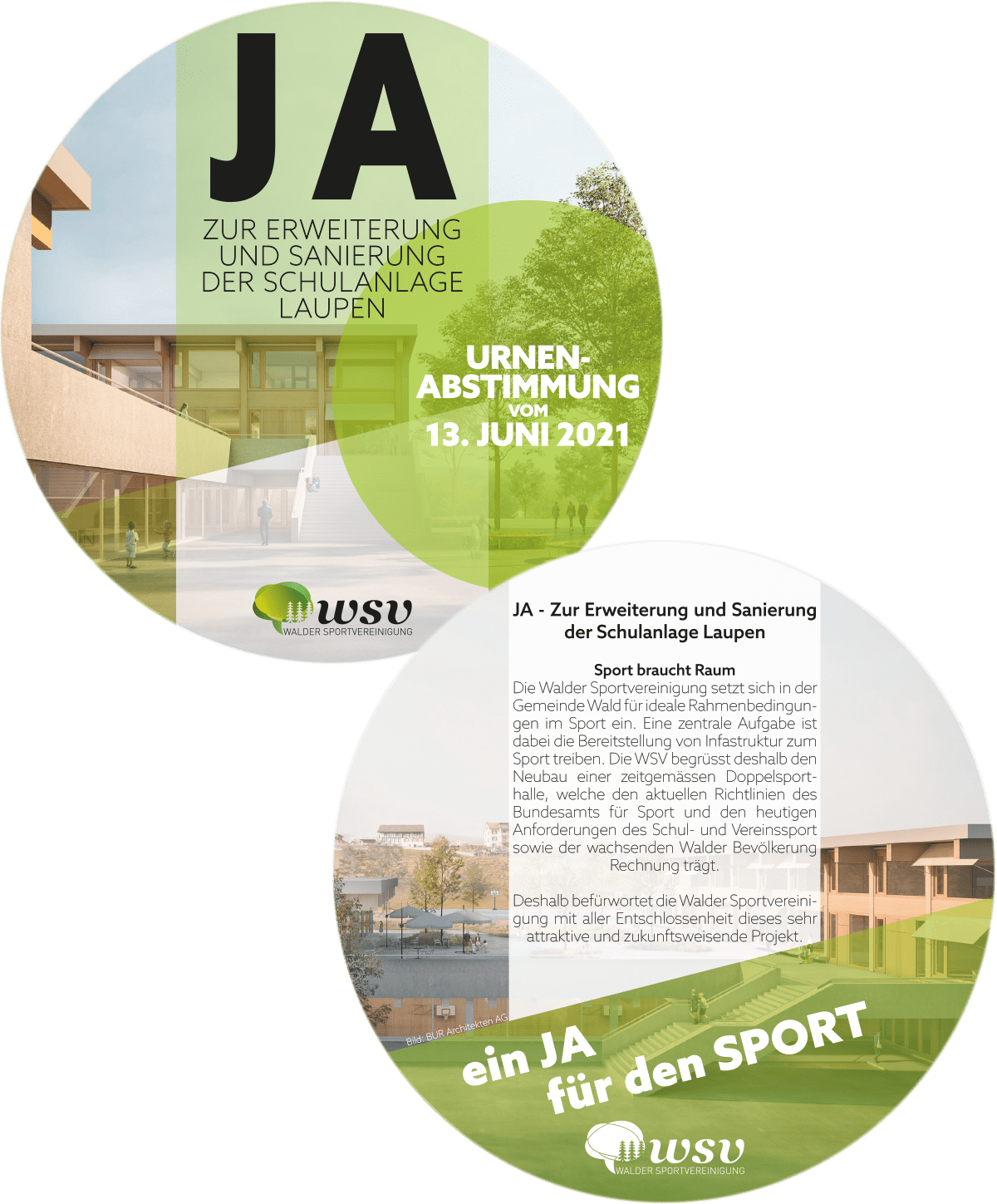 Die Schulanlage Laupen soll vergrössert und modernisiert werden, um dem Schülerzuwachs in unserem Dorf sowie den pädagogischen Anforderungen der heutigen Zeit gereich zu werden. Gleichzeitig wird die veraltete und zu kleine Turnhalle, durch eine neue, attraktive und zweckmässige Doppelsporthalle Sporthalle ersetzt. Die Walder Sportvereinigung begrüsst dieses Projekt, denn die Bereitstellung von Infrastruktur zum Sport treiben ist eine zentrale Massnahme, wenn es um Sportförderung geht. Der Mehrbedarf an Sportanlagen ist zudem im Sportanlagenkonzept der Gemeinde Wald ausgewiesen.